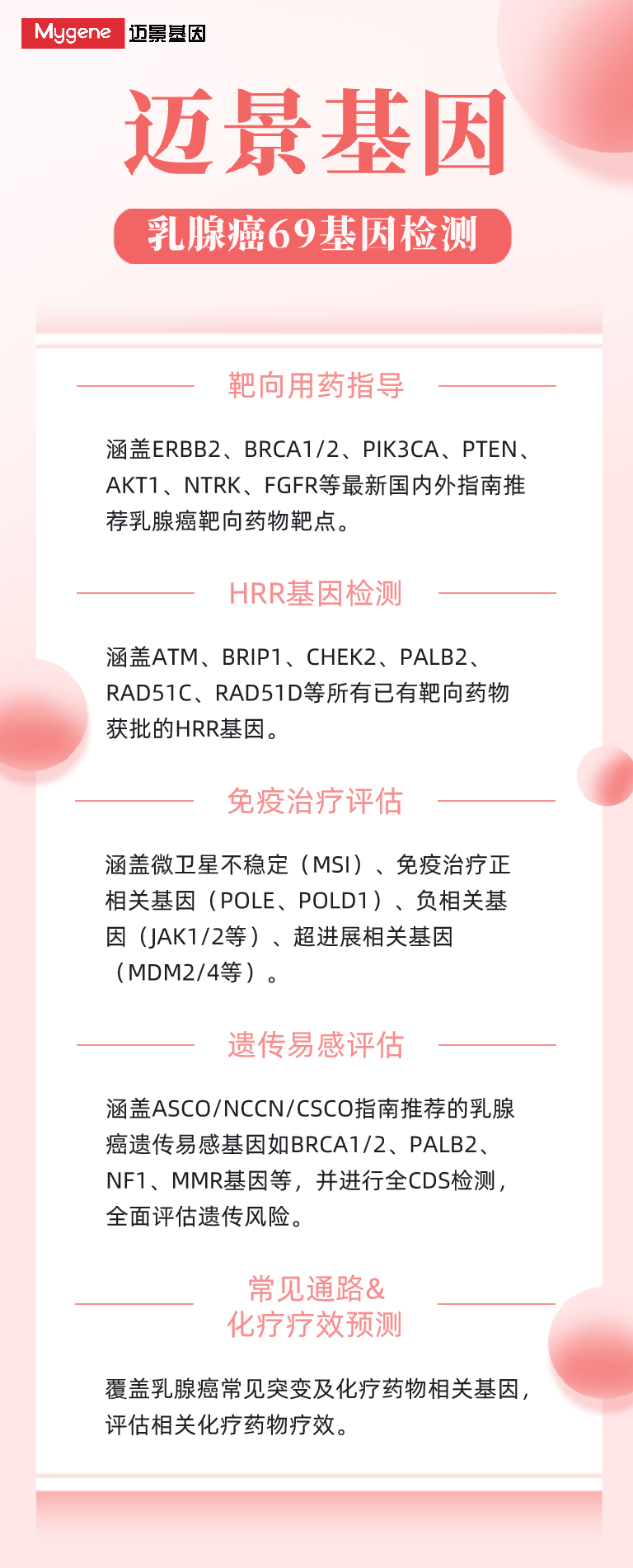 随着乳腺癌PIK3CA抑制剂和AKT抑制剂相继获批,乳腺癌精准治疗相继而来的精准诊断需求急需满足,为此,威九国际基因全新推出乳腺癌69基因检测产品,该产品是一款指导靶向、免疫、遗传及疗效评估的高性价比综合型小Panel,聚焦乳腺癌患者的关键治疗决策点,助力医生实现更科学、更精准的治疗路径规划。